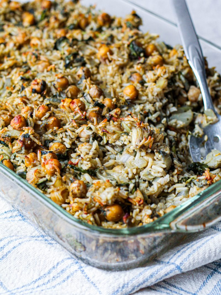 “This vegan, gluten-free chickpea brown rice spinach artichoke casserole incorporates the beloved spinach-artichoke combination into a grounding, nourishing vegan casserole that sticks to your ribs and is guaranteed to warm you right up.“