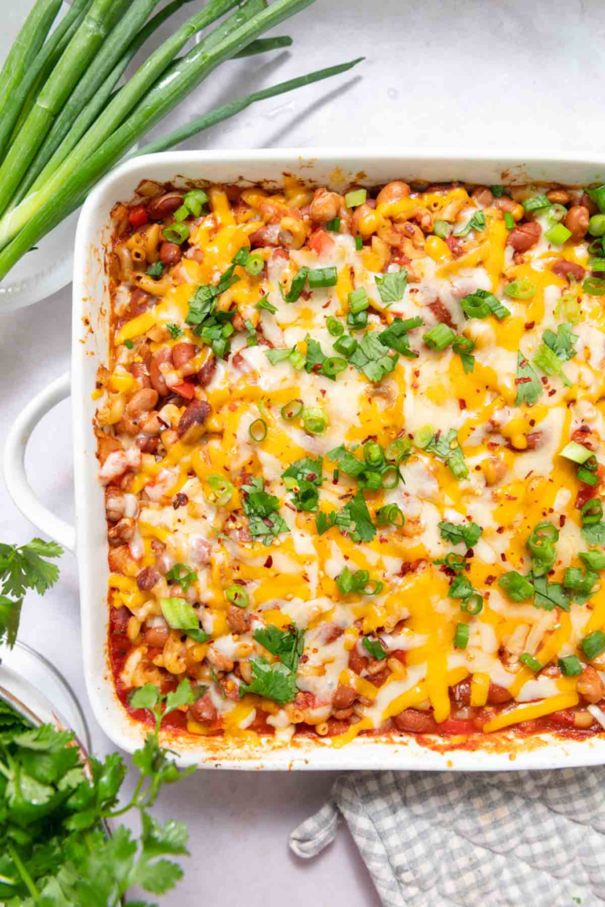 “This chili mac casserole is a dump & bake recipe that is like a combination of chili and mac and cheese. This recipe is vegetarian and ready in just over 30 minutes using mostly budget-friendly pantry staples!“