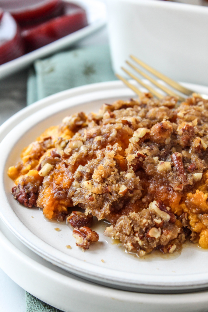 “A twist on the traditional sweet potato casserole with a dessert-like pecan streusel topping to perfect Thanksgiving!“