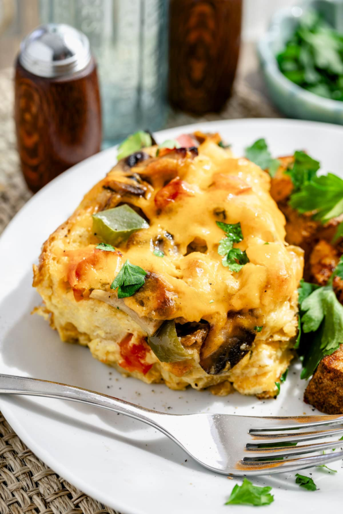 “This prep-ahead breakfast casserole is made with layers of sourdough bread soaked in cheesy egg custard and fresh sauteed vegetables“