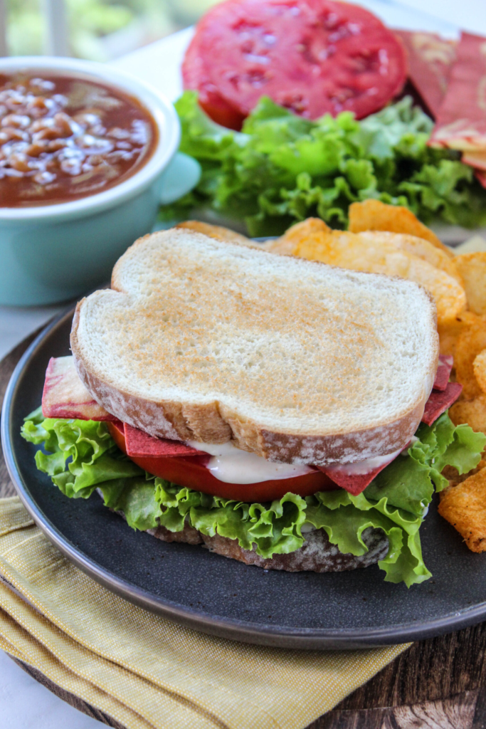 “A quick and easy vegetarian sandwich stacked high with layers of crispy vegetarian ‘bacon,’ fresh lettuce, and juicy tomato!“