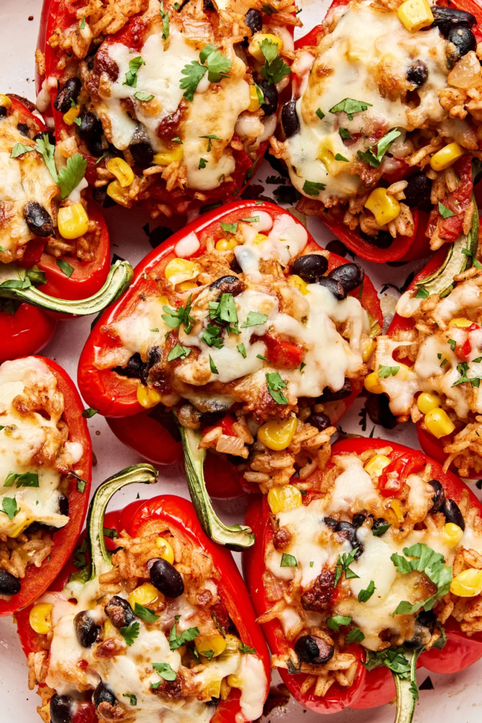 “Tender peppers brimming with a cheesy bean-and-rice filling are an easy, healthy dinner that’s sure to spice up your week.“