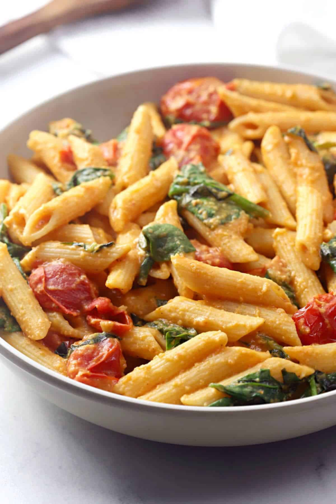 “Roasted red pepper hummus pasta is an easy, one pot dish that’s ready in less than 30 minutes! Penne pasta, spinach, and cherry tomatoes are coated in a creamy and flavorful hummus sauce.“