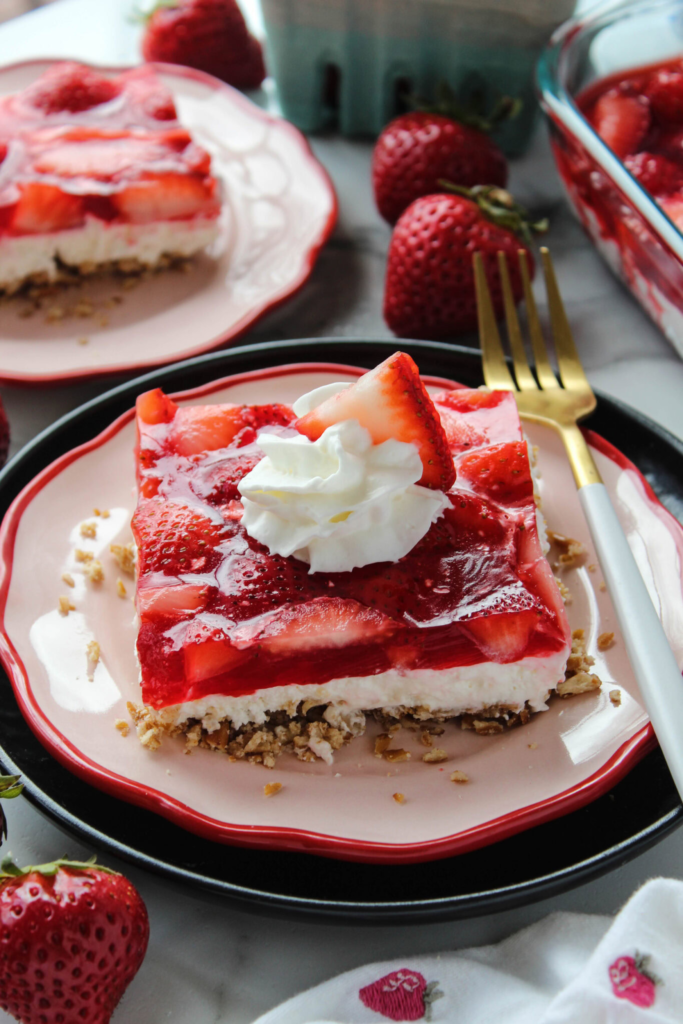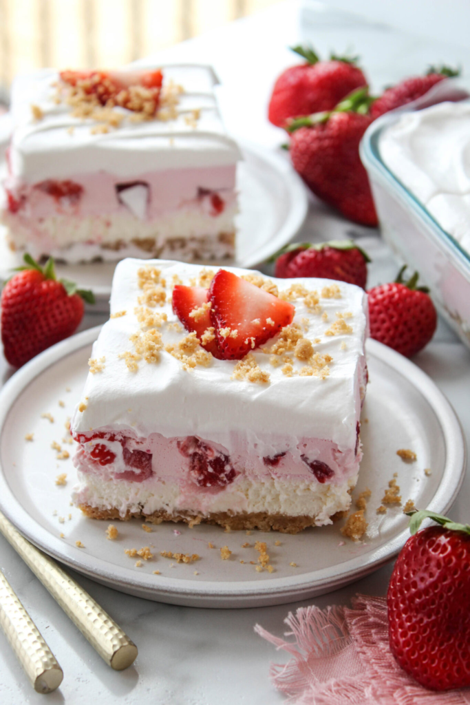 “A light and delicious layered no bake dessert that tastes just like strawberry shortcake in the summer!“