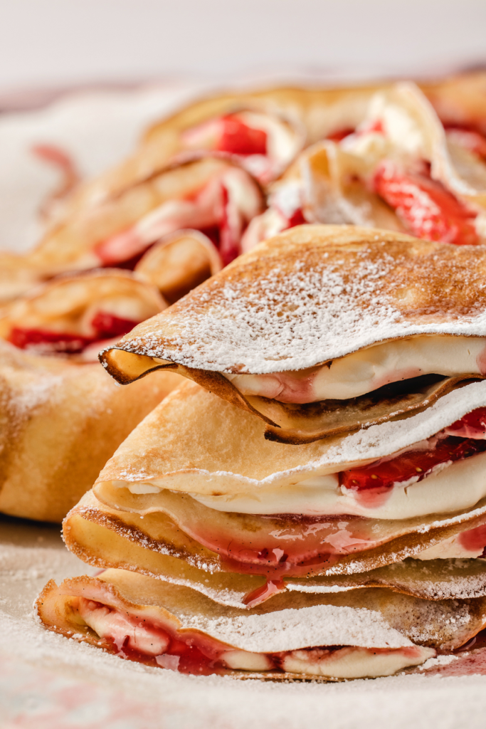 “They’re filled with homemade Chantilly cream and fresh strawberries for a sweet crepe that’s perfect for breakfast or dessert!“