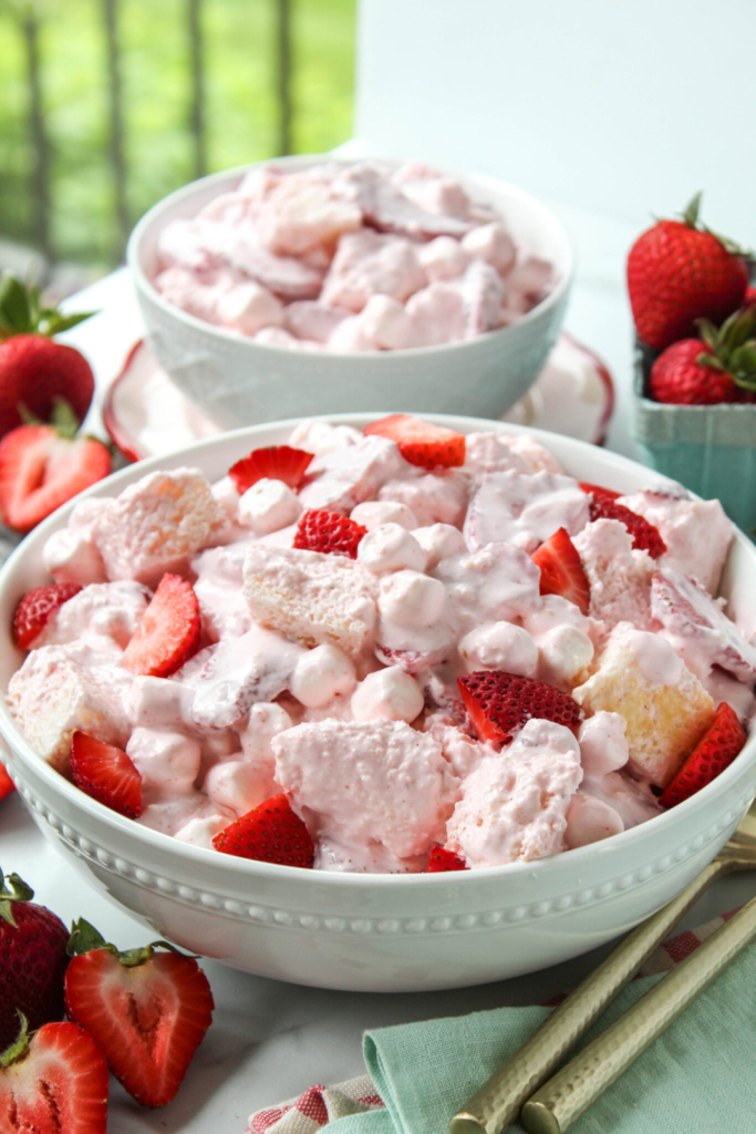 “A summer salad that combines flavors of strawberry shortcake with the traditional texture of fluff salad!“