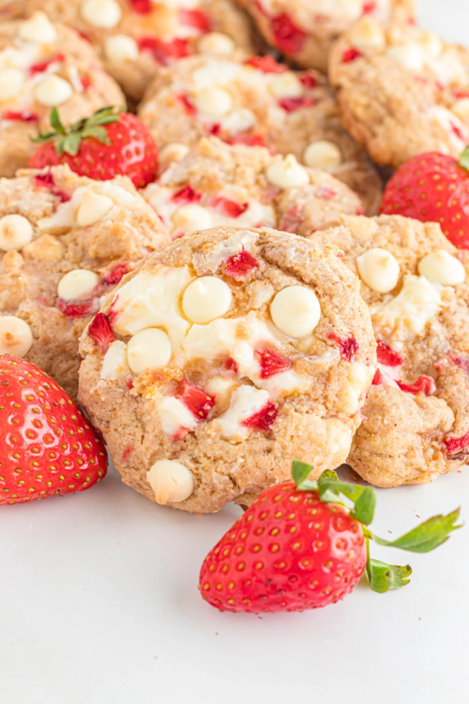 “Chewy Strawberry cheesecake cookies packed with fresh strawberries, white chocolate chips, and graham cracker pieces, and filled with a surprise cheesecake filling.“