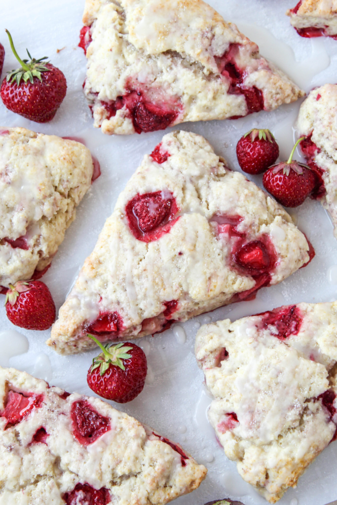 “Crumbly thick buttery scones packed with fresh strawberries in every bite with a light drizzle of icing on top!“