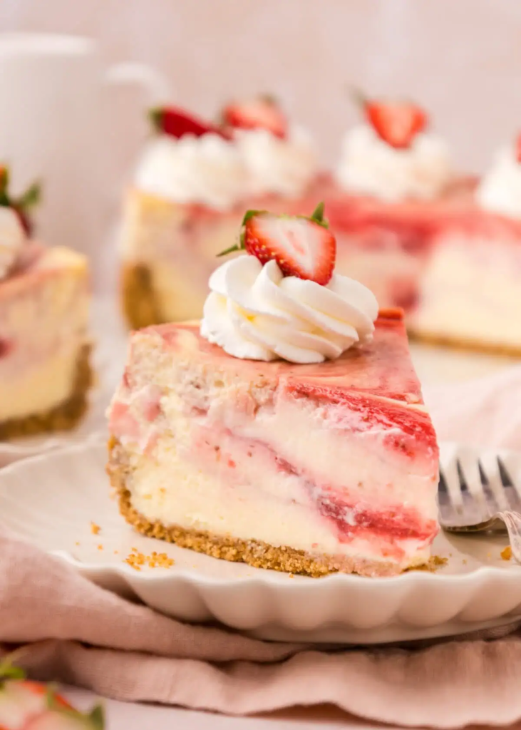 “A creamy cheesecake filling swirled with a fresh strawberry sauce, and made with a homemade graham cracker crust.“
