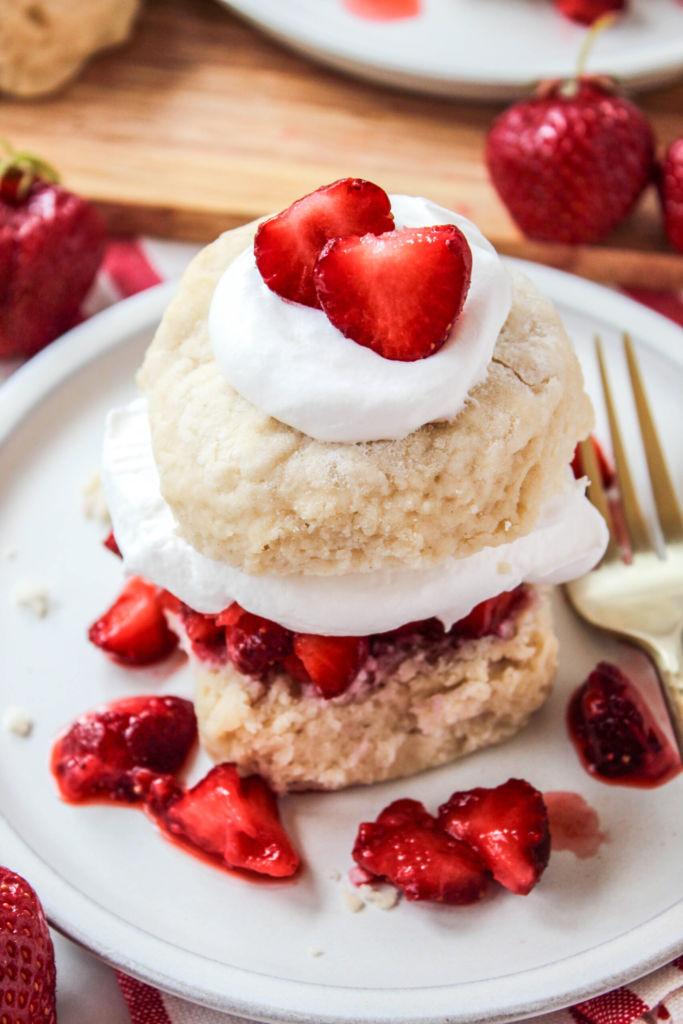 “Juicy strawberries sandwiched between homemade biscuits and a dollop of whipped cream makes for a delicious sweet treat!“