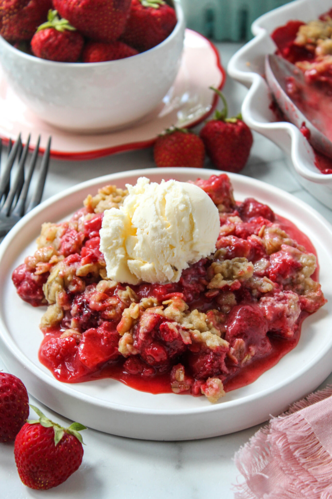 “Juicy strawberries baked under a buttery, crumbly oat topping! This is the perfect fruit-filled summer dessert!“