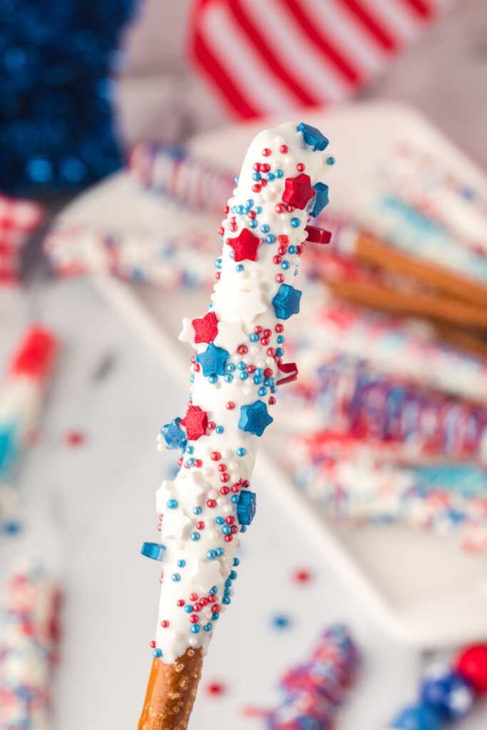 “A sweet and salty snack dressed for the 4th of July! These are the perfect little patriotic treats!“