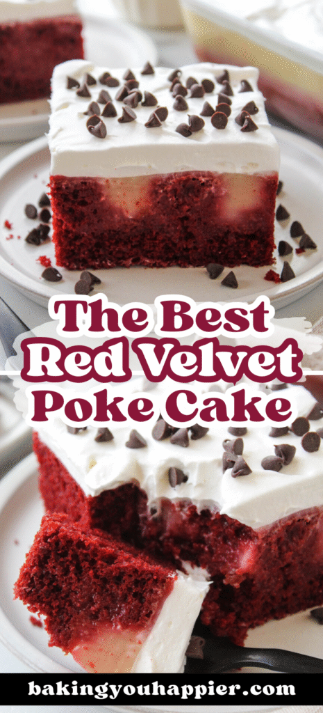 Red Velvet Poke Cake, an ultra-moist dessert that melts in your mouth with every dreamy bite soaked in cheesecake pudding!
