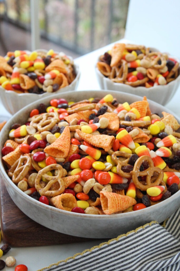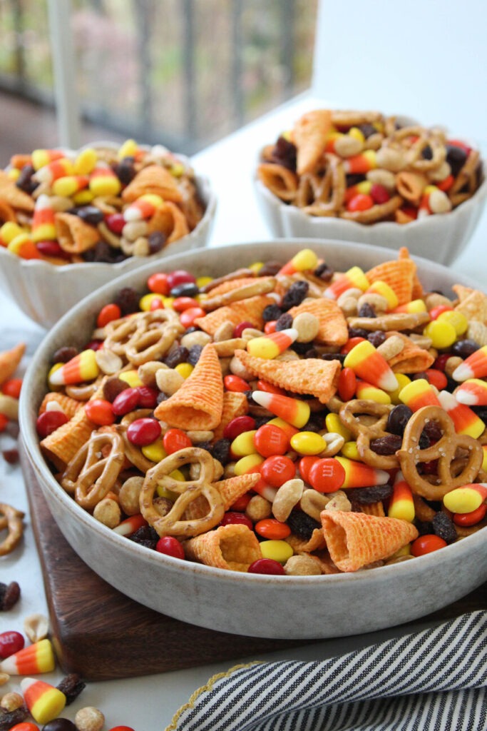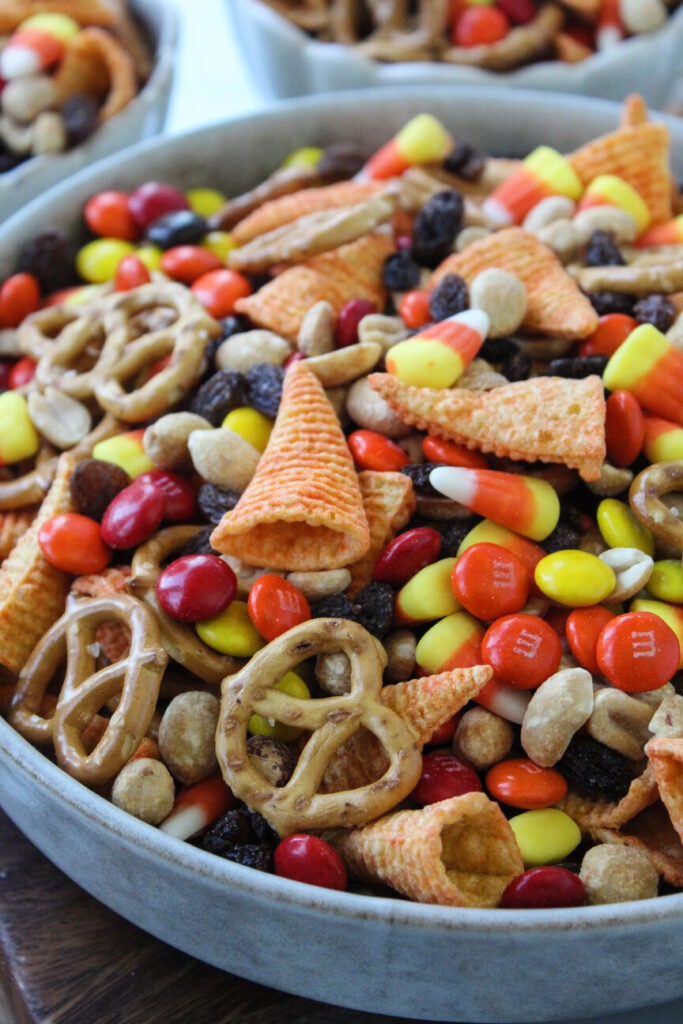 - In a large bowl, mix together 2 cups bugles, 2 cups mini pretzels, 1 cup salted peanuts, 1 cup M&M’s, 1 cup candy corn, and 1 cup raisins (or craisins).