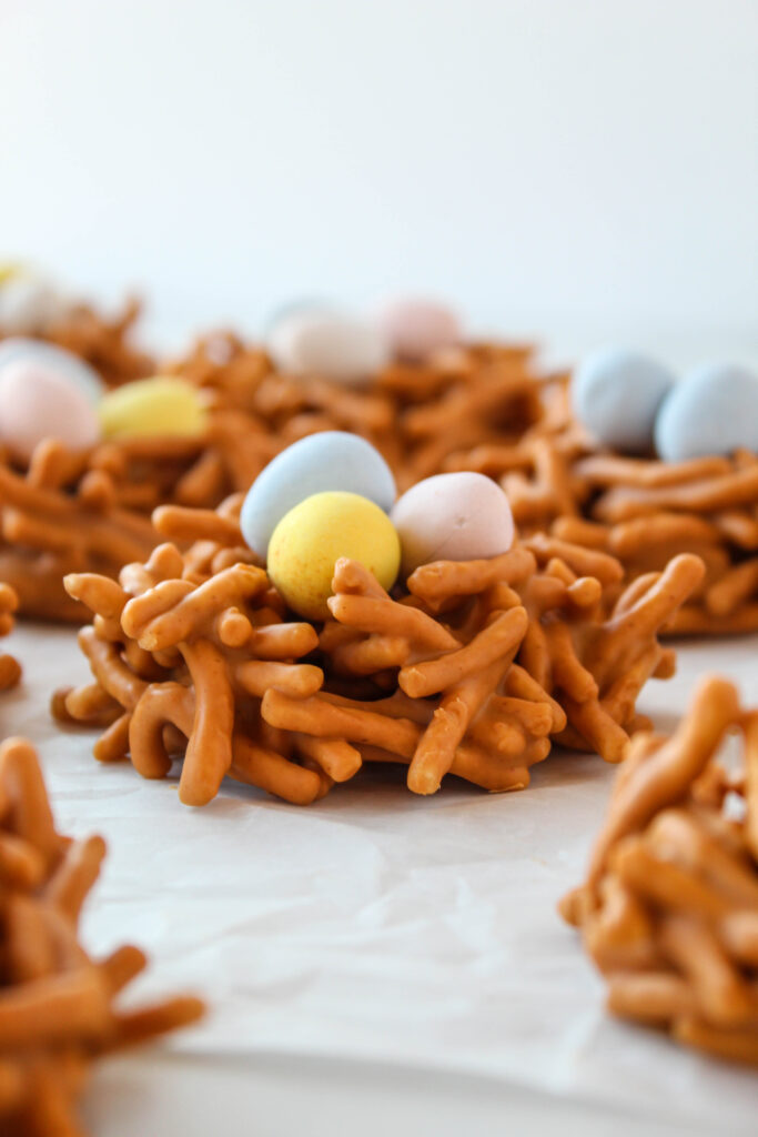 - Scoop desired amount into the shape of a nest on a parchment paper lined pan. Top with chocolate Easter egg candy.