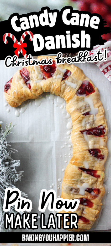 Candy Cane Danish, a holiday pastry shaped like a candy cane filled with a cream cheese mixture & cherry pie filling and topped with icing!