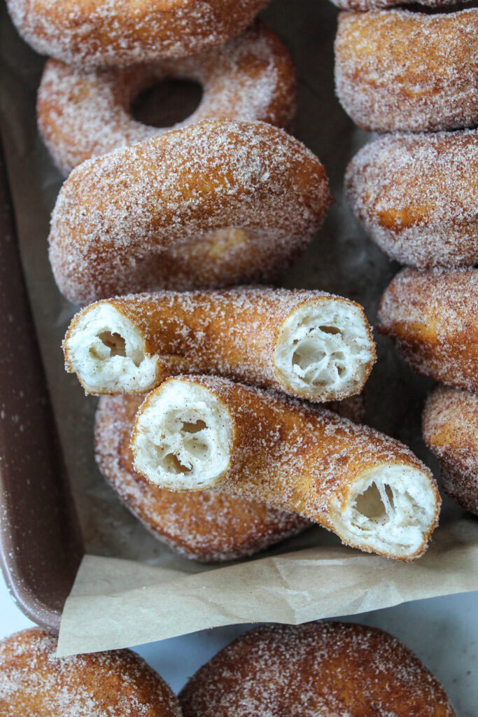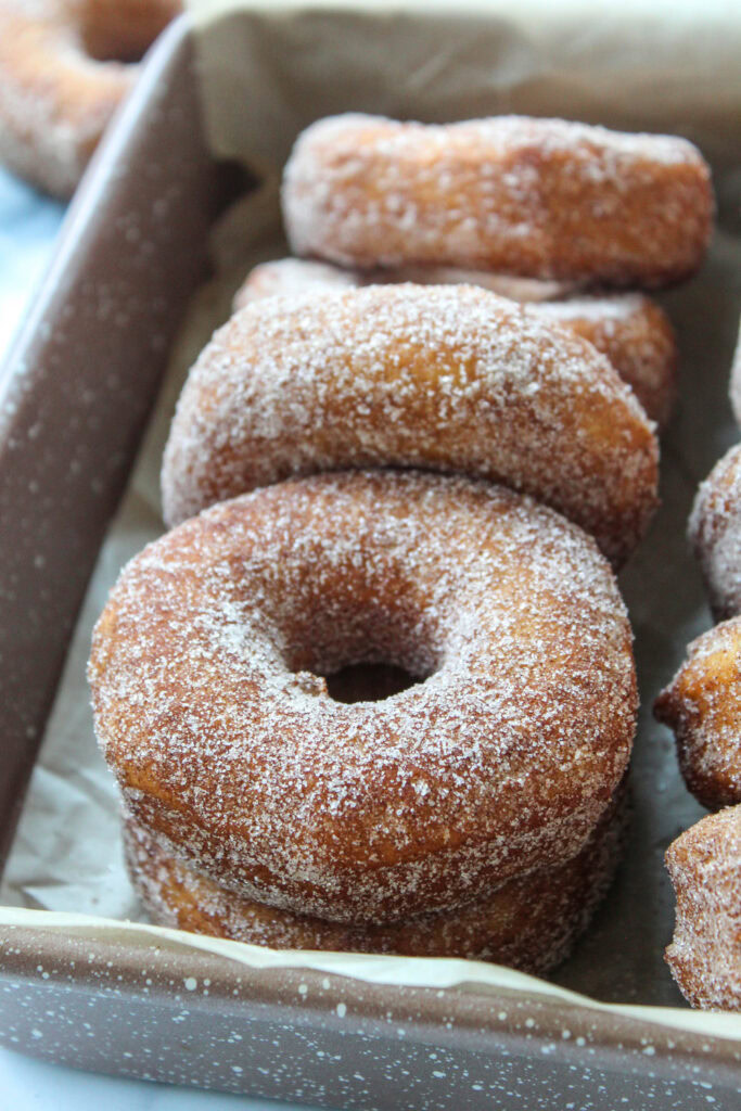 - Once the donuts are cooled, toss into the cinnamon sugar mixture one at a time, coating well. Return to the drying rack and repeat until all donuts are covered.