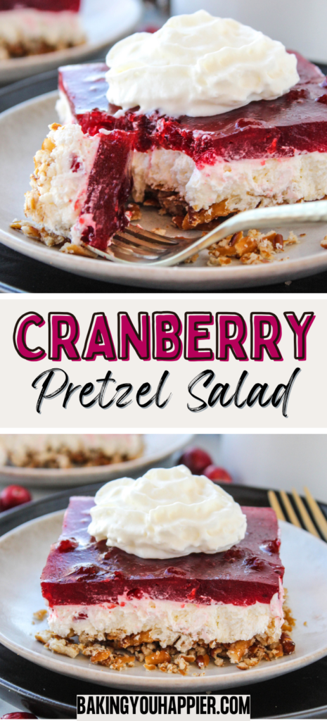 Cranberry Pretzel Salad, a delicious combination of sweet, salty, and whipped creamy filling topped with cranberries for Thanksgiving!