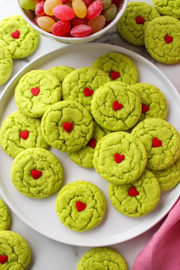 Grinch Cake Mix Cookies, a fun, festive neon green cookie that is easy to make and inspired by everyone's favorite holiday grump!