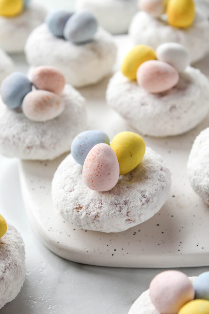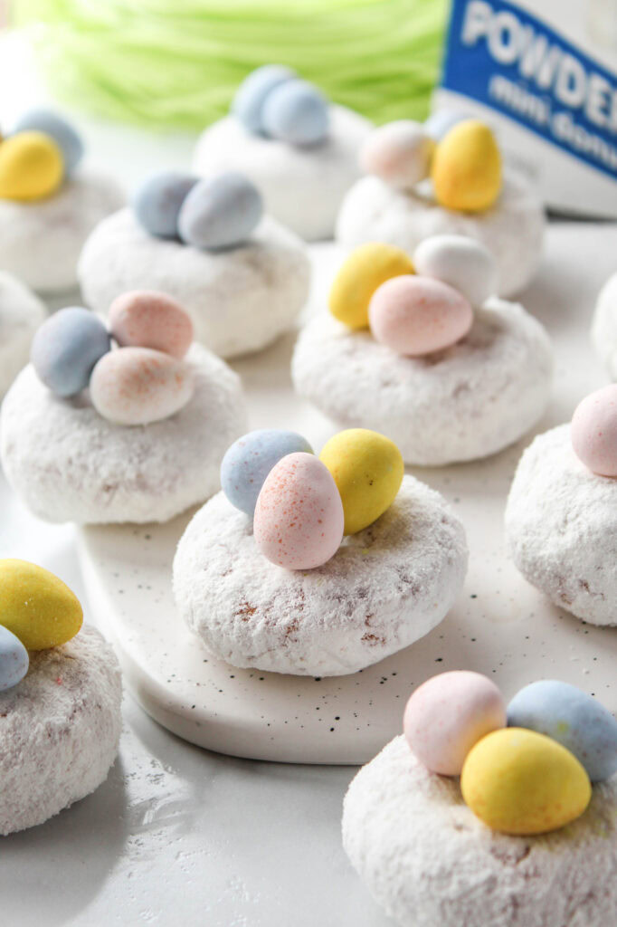 Mini Powdered Donut Bird Nests, just pull out store bought mini powdered donuts from the bag and set candy eggs on top to make a bird nest!