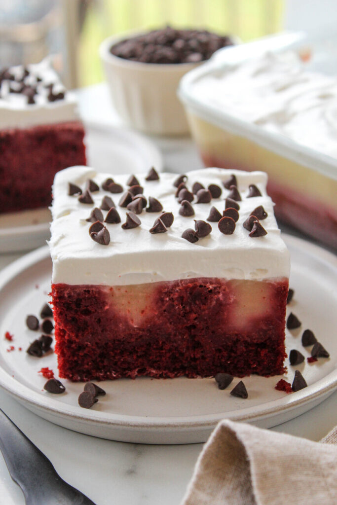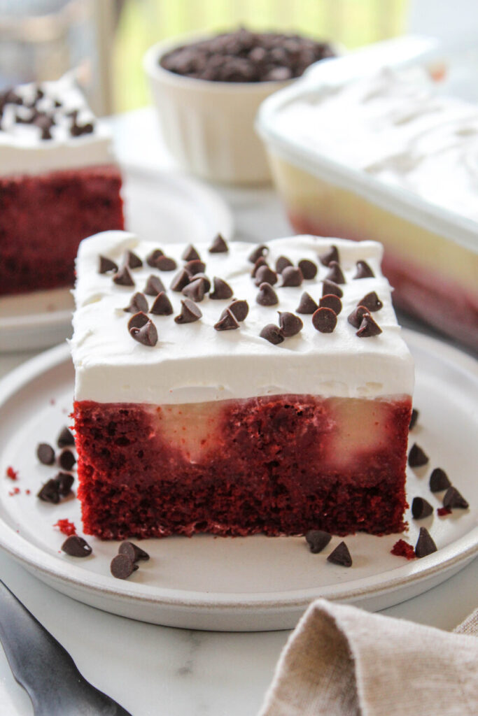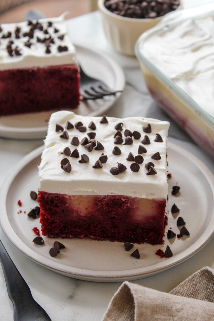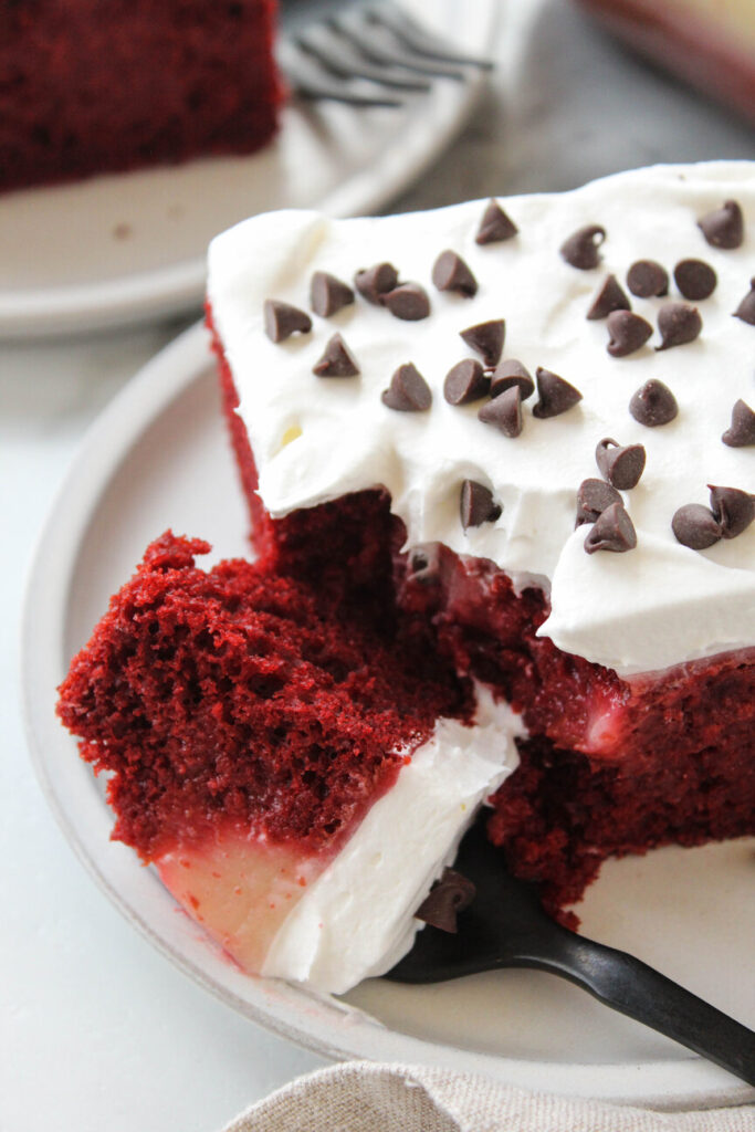 I think, I can’t say for sure, but I think this Red Velvet Poke Cake was the first poke cake I ever made. It was so long ago, all I remember is being hooked on the idea of poke cakes!