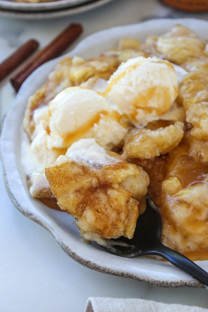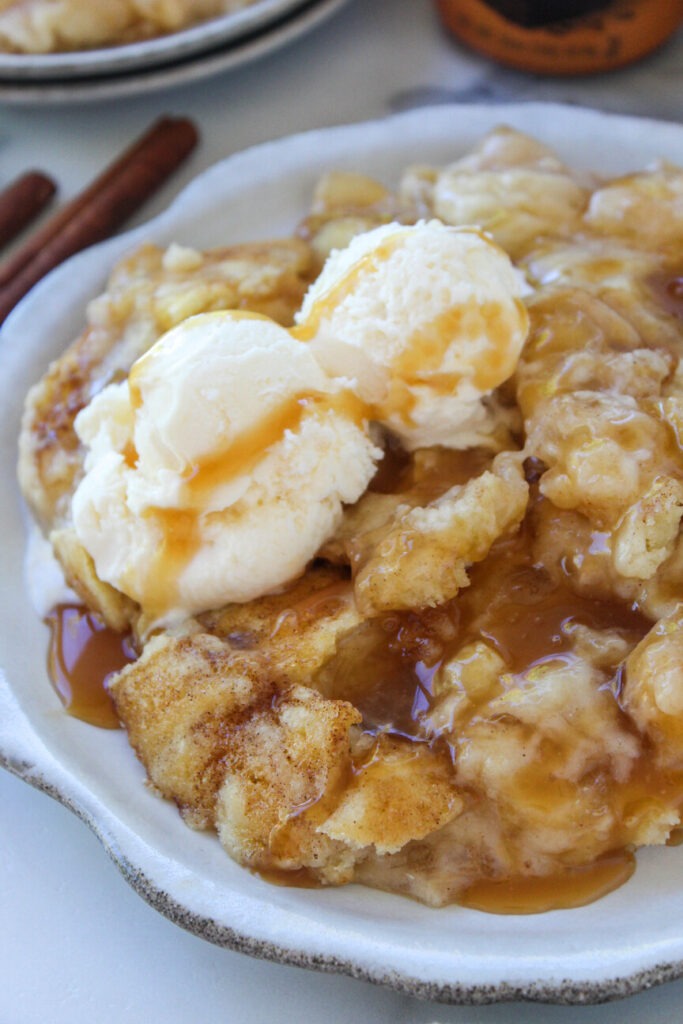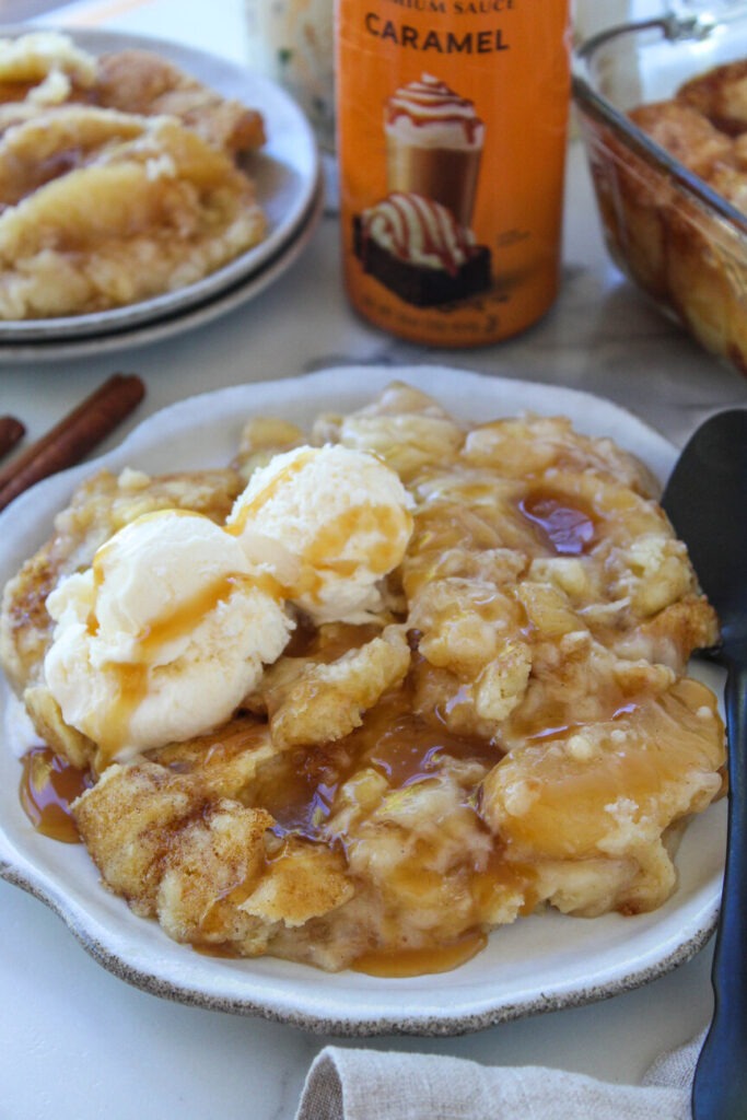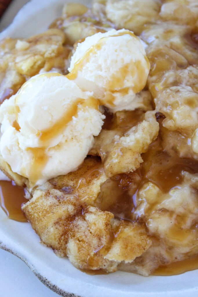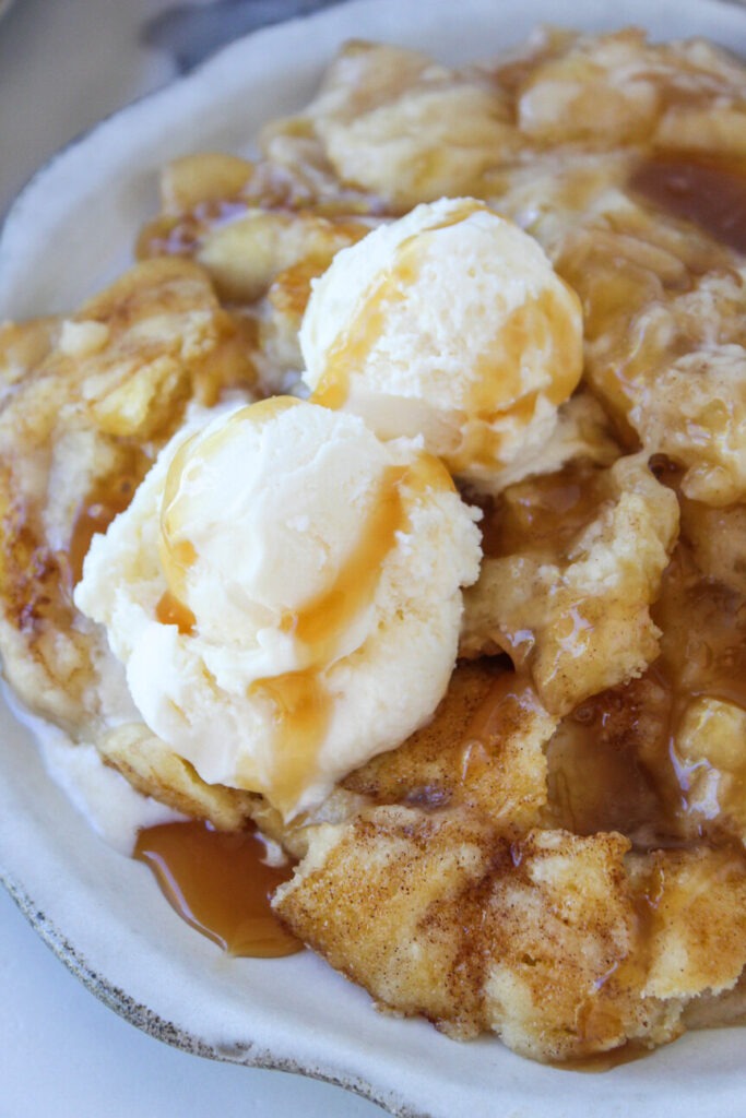 This dessert tastes like a cinnamon sugar cookie meets gooey cobbler with caramel bubbling through!
