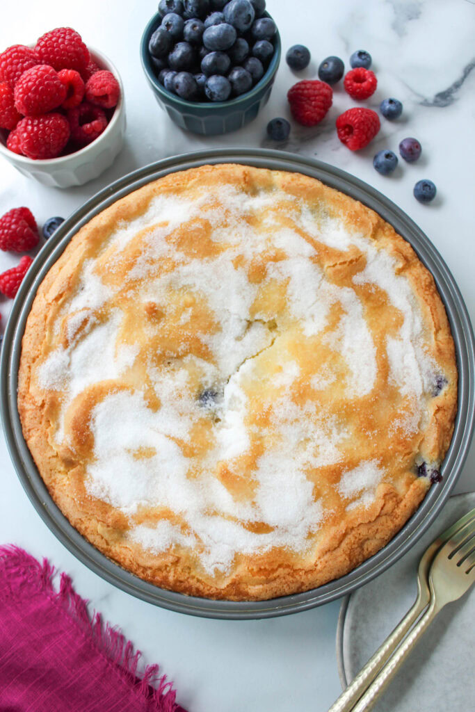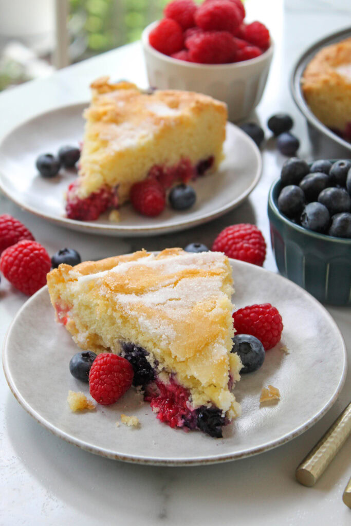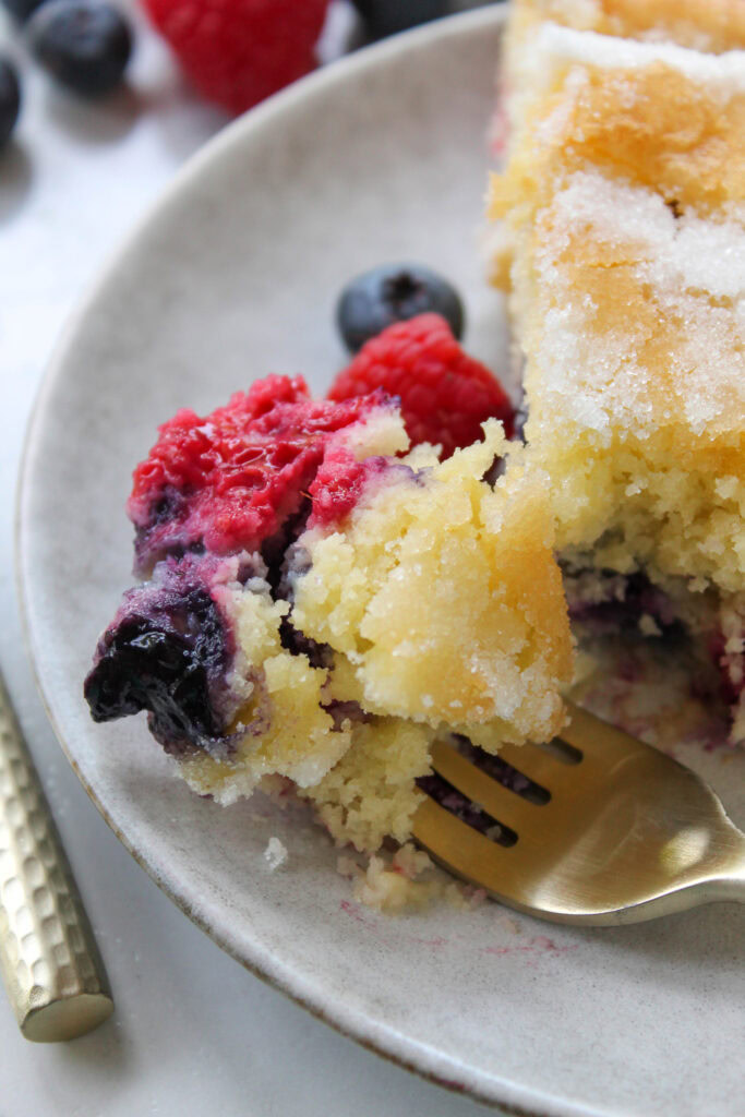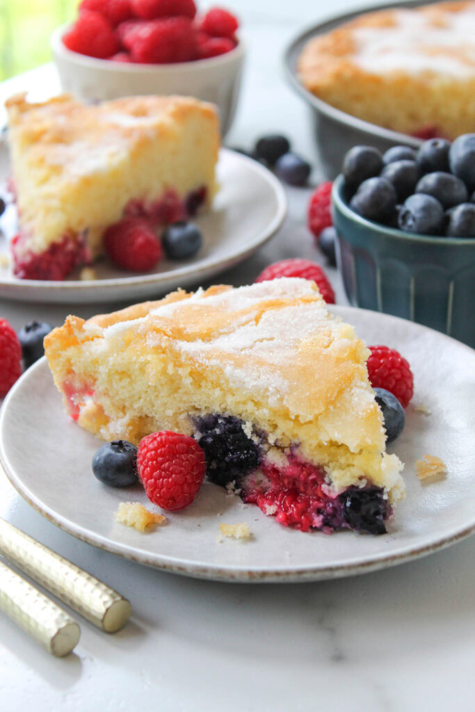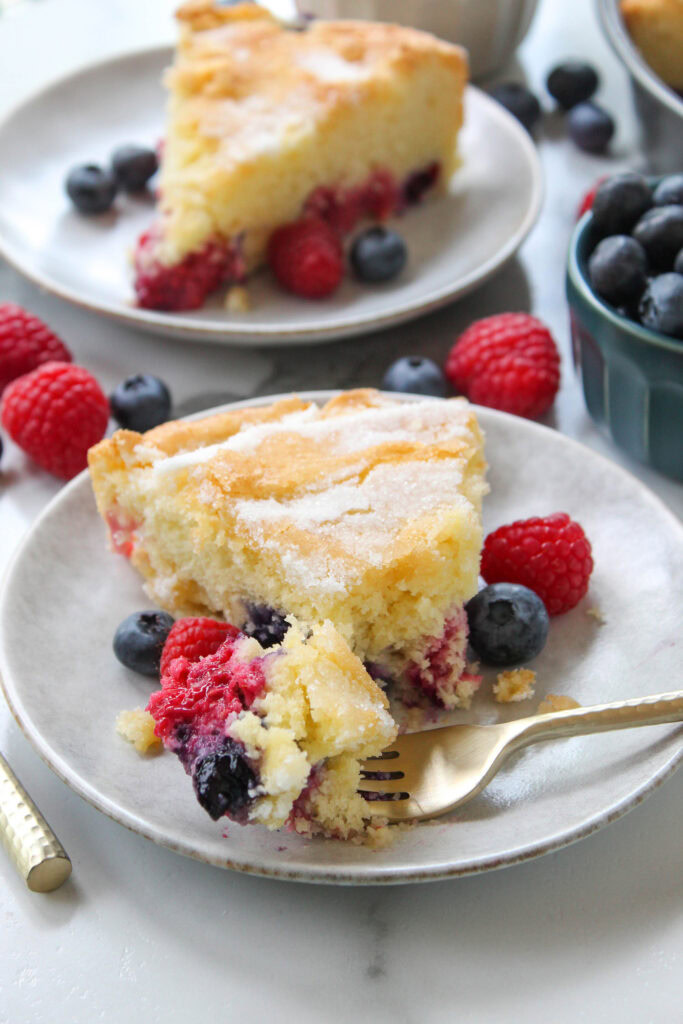 A fresh, vibrant summer dessert with a soft, moist, buttery cake base packed with fresh berries!