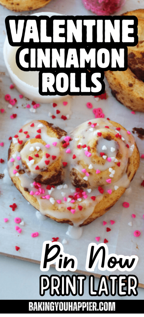 - Warm icing for 10-15 seconds in the microwave and drizzle over the cinnamon rolls. Sprinkle with Valentine sprinkles.