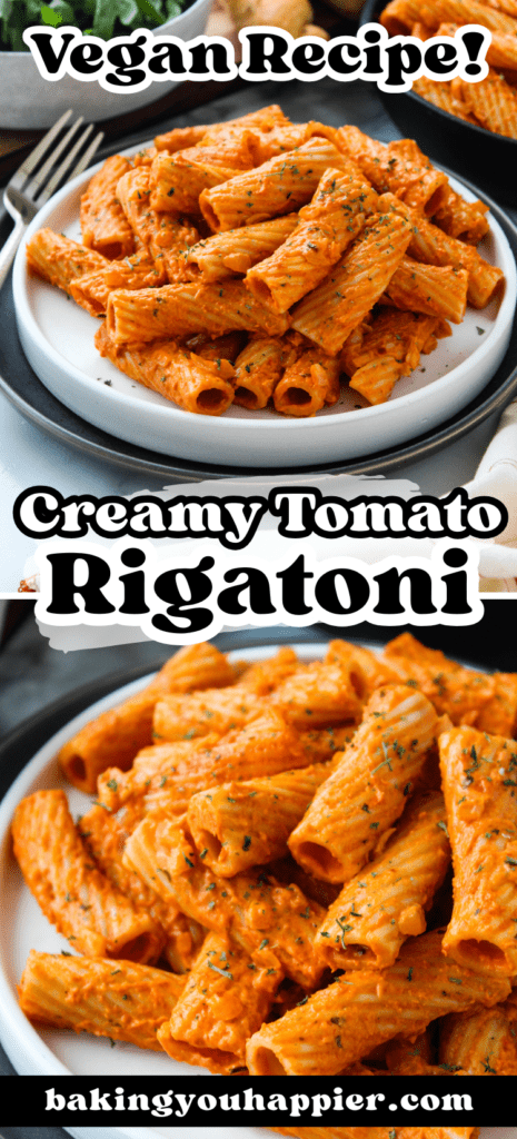 Vegan Creamy Tomato Rigatoni Pasta, a comforting, plant-based dish that is rich, full of bold flavor, and coated in luscious tomato sauce!